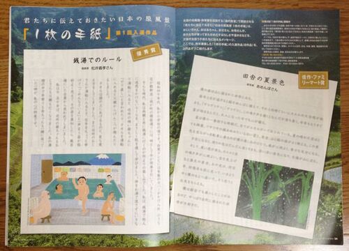 公益社団法人国土緑化推進機構の広報誌「ぐりーん・もあ」62号で、 「君たちに伝えておきたい日本の原風景 『1枚の手紙』」第2回入選作品の挿絵を担当しました。 今回も古谷充子さんとペア。 私が担当したのは田舎の夏のことを書いたもの。 描く前に知人…